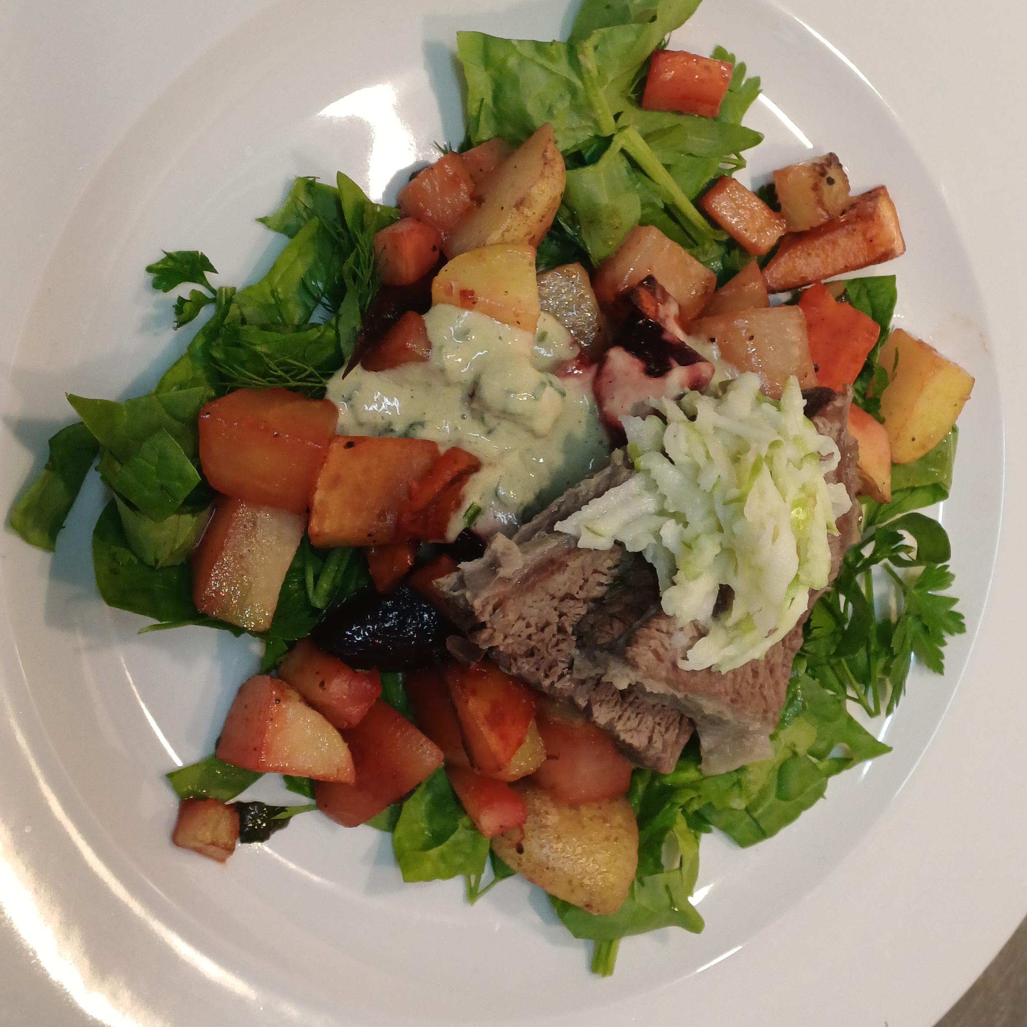 Tafelspitz vom heimischen Rind mit Apfel-Meerrettich dazu Wurzelgemüsepfanne mit Porree-Rahmsoße und frischen Kräutern