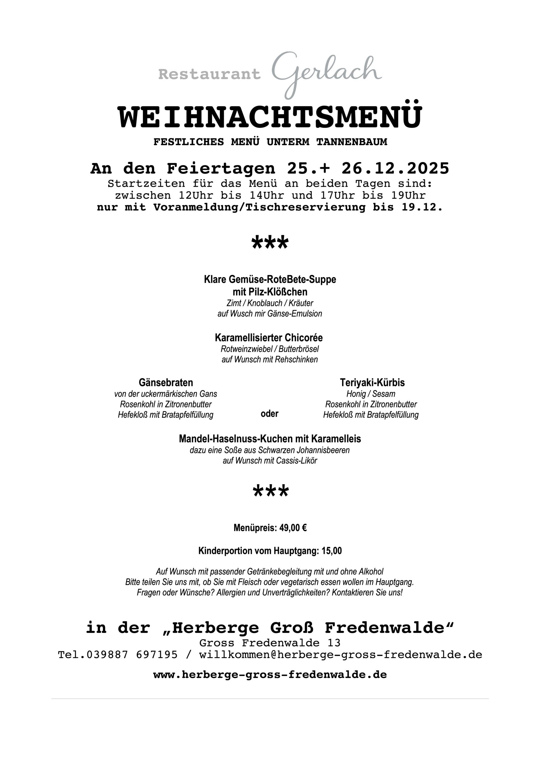 Weihnachtsmenü 25.+26.12. nur mit Reservierung bis 19.12.